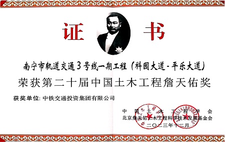 斬獲雙料大獎!中鐵交通南寧軌道交通3號線項目再獲詹天佑獎