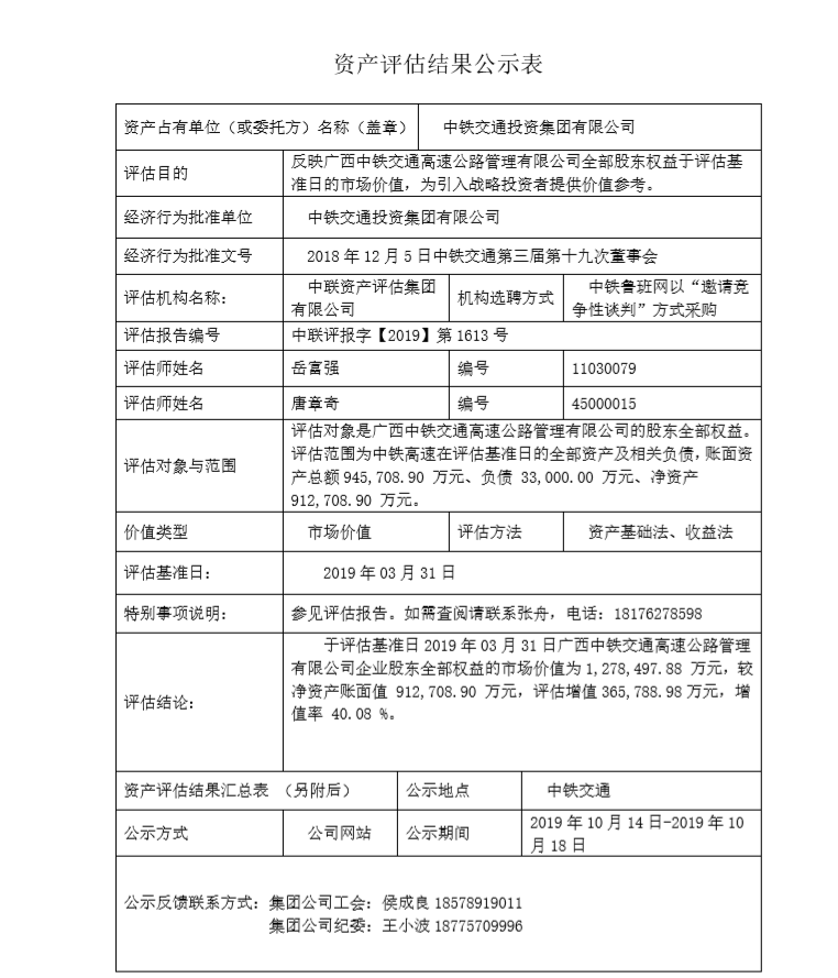 2018年12月5日,經中鐵交通集團第三屆第十九次董事會審議通過引入戰略投資者的議案,并就中鐵高速全部股東權益組織了資產評估。根據國資委《關于建立中央企業資產評估項目公示制度有關事項的通知》(國資發產權〔2016〕41號),以及股份公司《中國中鐵股份有限公司資產評估公示暫行辦法》(中鐵股份財務〔2016〕153號)的要求,現將資產評估結果進行公示。
