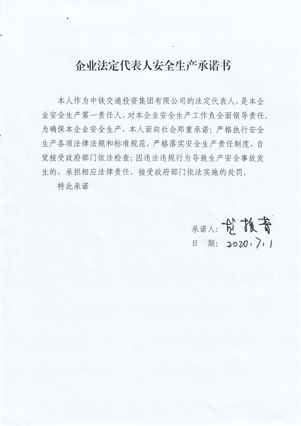 企業法定代表人安全生產承諾書